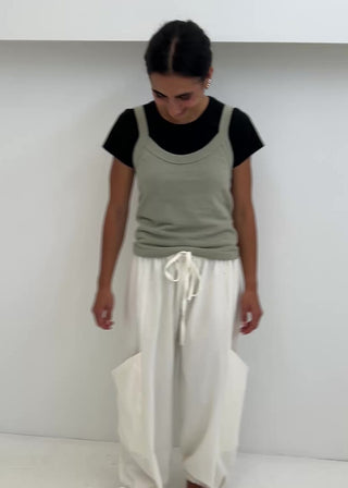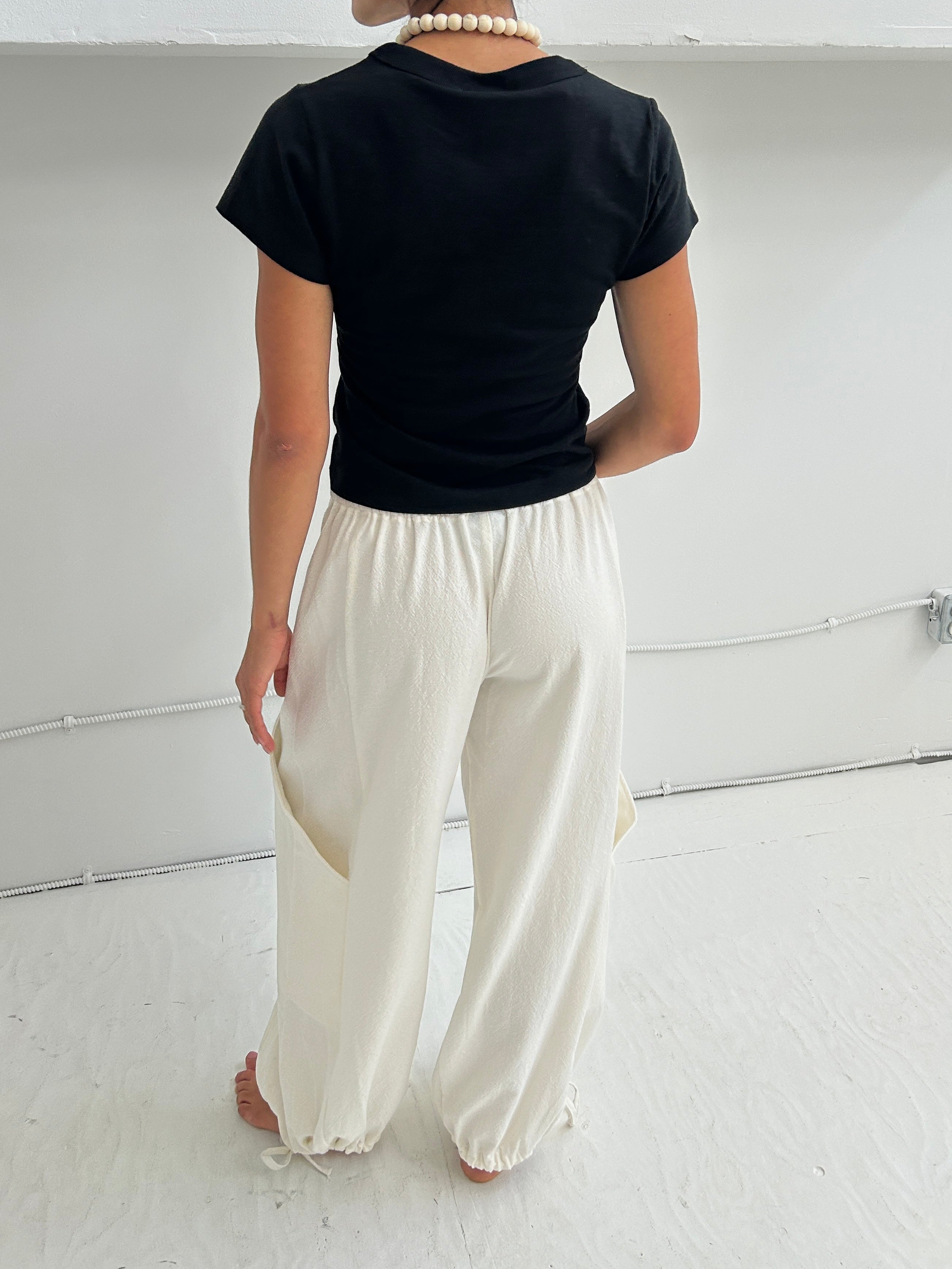 The rounded silhouette sits at a low-to-mid rise with plenty of room to move. Deep side pockets and adjustable ankle ties let you adjust the fit to suit you, gathered or loose for a straight leg.